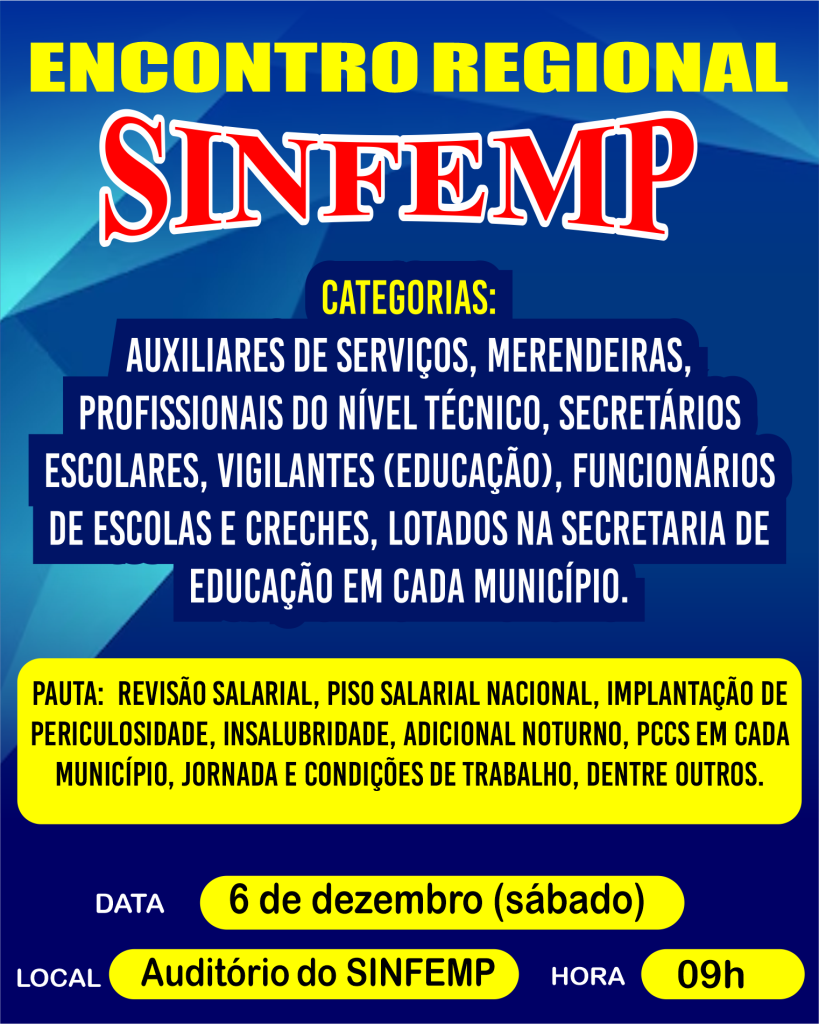 O SINFEMP – Sindicato dos Funcionários Públicos Municipais de Patos e Região, realizará no dia 6 de dezembro de 2025( sábado), a partir das 09:00 horas da manhã, em seu Auditório em Patos, o Encontro Regional com todos os profissionais do nível médio, auxiliares de serviços, Merendeiras, secretários escolares, vigilantes, lotados nas secretarias de educação, para discutir o Piso Salarial Nacional das categorias, PL 2531/2021, que tramita no congresso nacional.