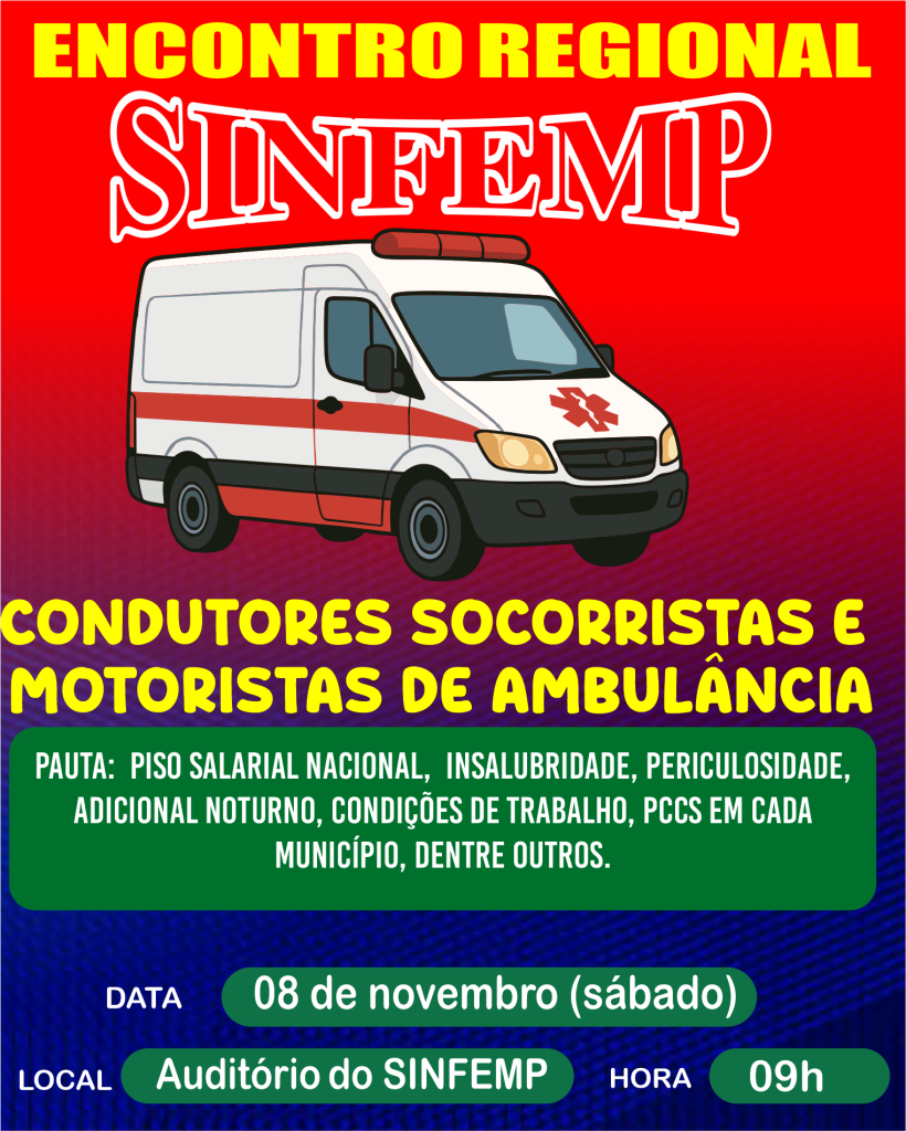 O SINFEMP – Sindicato dos Funcionários Públicos Municipais de Patos e Região, realizará no dia 8 de novembro ( sábado), a partir das 09:00 horas da manhã em sua Sede própria, localizada na Rua Dezoito do Forte,140 Santo Antônio em Patos, o Encontro Regional de Condutores Socorristas e motoristas de Ambulância dos municípios de Patos, Malta, Condado, Vista Serrana, São José de Espinharas, São Mamede, Várzea, São José do Sabugi, Junco do Seridó, Tenório, Quixaba, Cacimba de Areia, Passagem, Areia de Baraúnas, Salgadinho, Assunção, São José do Bonfim, Mãe D’água, Santa Terezinha, Catingueira, Emas e Olho D’água.