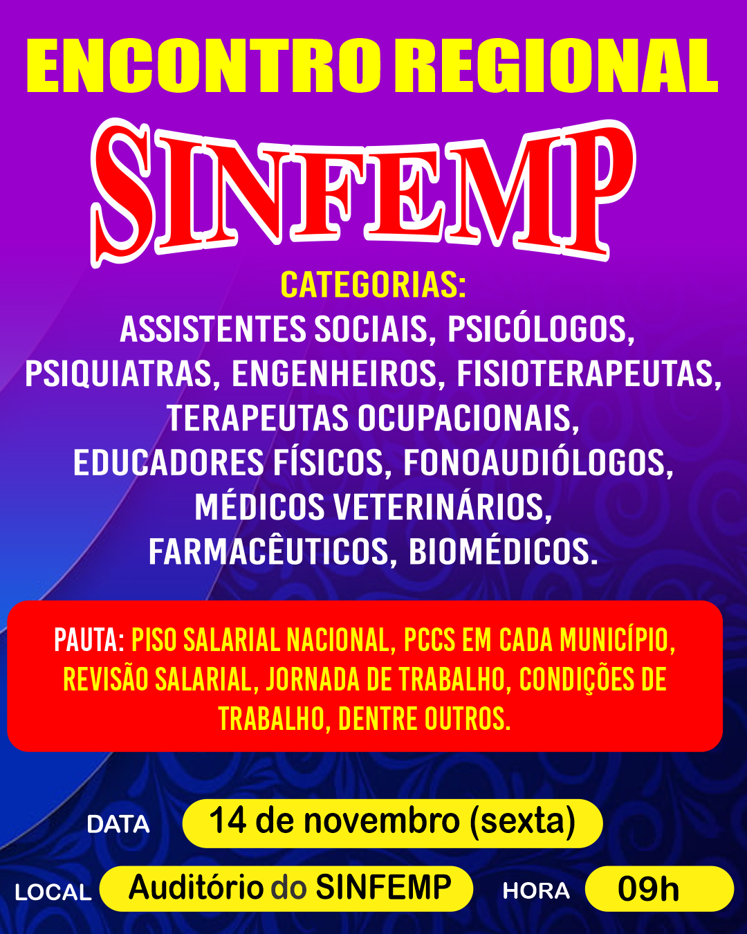 O SINFEMP – Sindicato dos Funcionários Públicos Municipais de Patos e Região, realizará no dia 14 de novembro de 2025, sexta -feira, a partir das 09:00 horas da manhã, o Encontro Regional com as categorias de assistentes sociais, psicólogos, psiquiatras, engenheiros, fisioterapeutas, terapeutas ocupacionais, Fonoaudiólogos, educadores físicos, farmacêuticos, biomédicos e nutricionistas, com o objetivo de discutir o Piso Salarial Nacional para diversas dessas categorias, as condições e jornada de trabalho, revisão salarial, PCCs específico em cada município, dentre outras reivindicações.