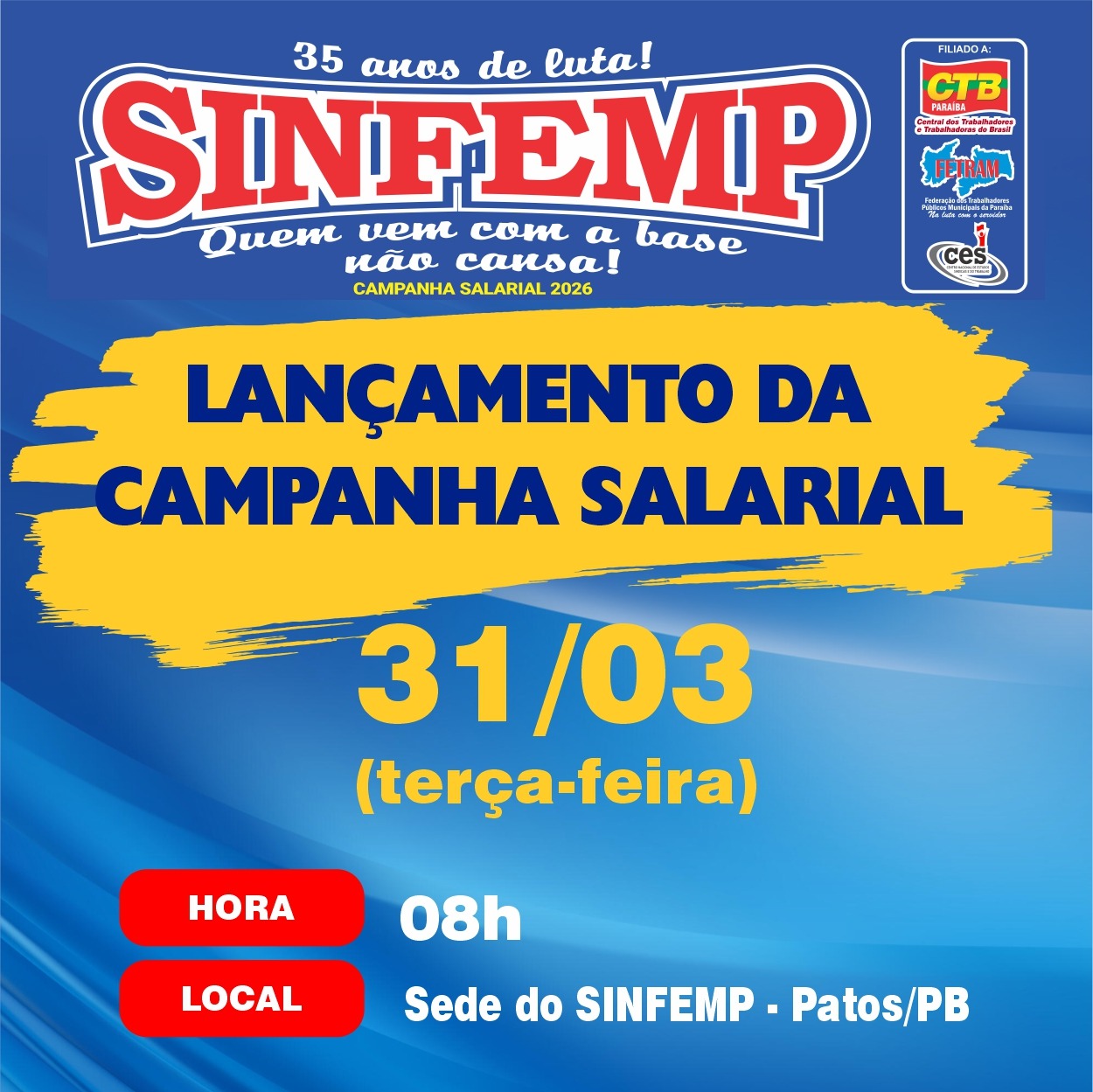 O SINFEMP – Sindicato dos Funcionários Públicos Municipais de Patos e Região, fará no dia 31 de março, terça -feira, o lançamento da Campanha Salarial 2026, que tem como tema: Quem vem com a base não cansa!