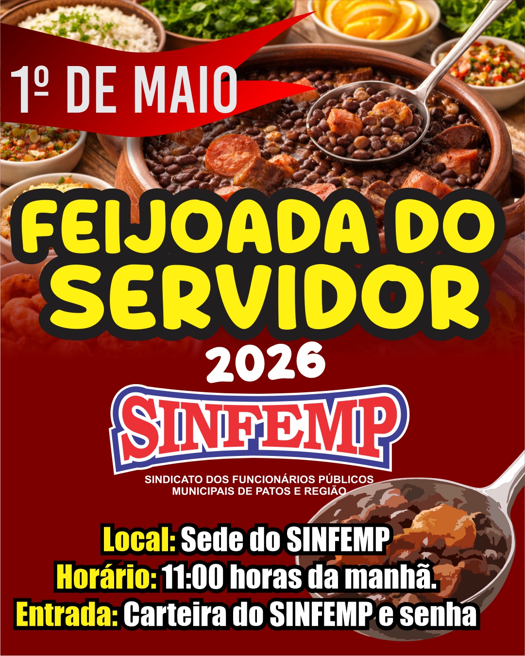 O SINFEMP – Sindicato dos Funcionários Públicos Municipais de Patos e Região, realiza no dia 1° de maio de 2026, sexta -feira, em sua Sede em Patos, a Feijoada do Servidor, que tem atraído muitos associados no dia internacional dos trabalhadores e trabalhadoras.